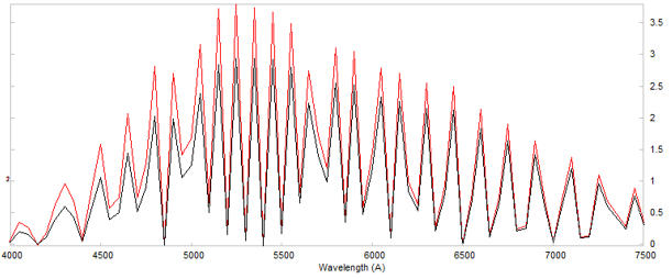 Кривая oценки эффективности прибора. Красная кривая - с учетом кривой атмосферной экстинкции места наблюдений, черная кривая - без учета. Использовалась ПЗС матрица с размером пикселя 9 мкм и максимальной квантовой эффективностью QE max = 55 %. Качество “неба”: 1.5 угловых секунд.